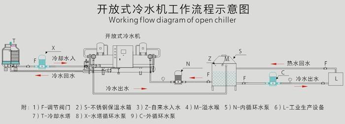 3、開放式冷水機(jī)組跟水冷式冷水機(jī)組結(jié)構(gòu)運(yùn)行原理一樣,開放式需要配置一臺(tái)循環(huán)儲(chǔ)水箱和外循環(huán)水泵;